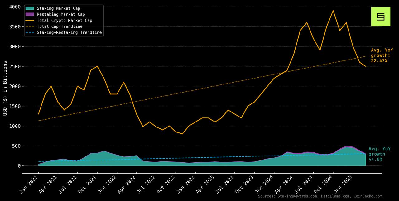 - While crypto market cap grew 22% YoY since 2021, staking and restaking quietly doubled that at 45%.